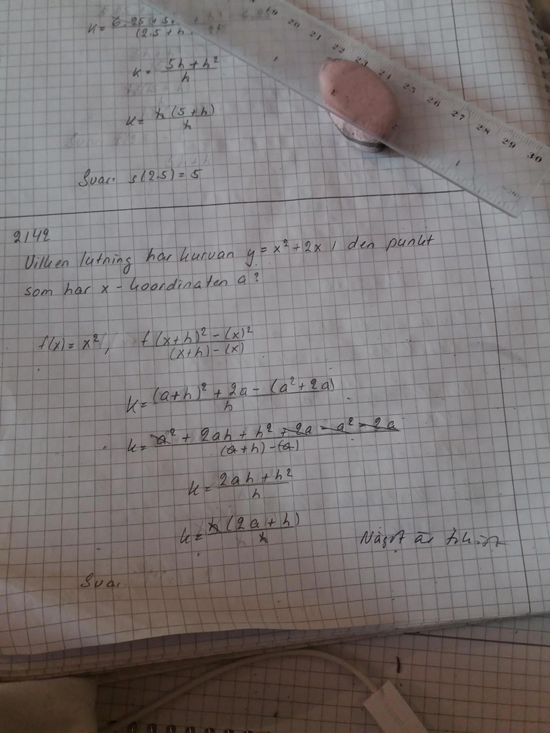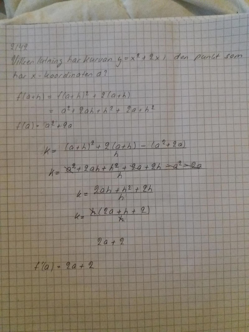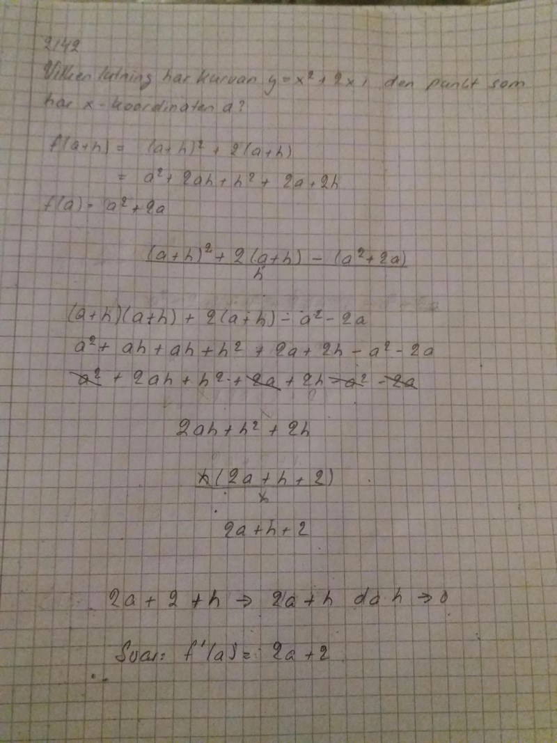 Det mesta är jättebra. Ett par små detaljer bara: När du beräknar f(a+h) skriver du fel sist på andra raden och skriver h2 h^2 när det borde stå 2h - fast när du sätter in det i uttrycket för k skriver du rätt. Fast du borde inte kalla det k - det blir inte k förrän du har låtit h gå mot 0. Och så borde du skriva att det är det du gör på slutet.