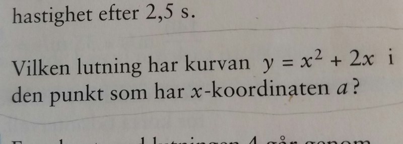 Om vi nu låter h närma sig noll så kommer 2a+2+h 2a + 2 + h närma sig värdet 2a+2 2a + 2 . Därför gäller det att kurvans lutning där x = a ges av 2a+2 2a + 2 .