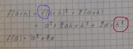 f(a+h)=(a+h)2+2(a+h)=a2+2ah+h2+2a+2h f(a + h) = (a + h)^2 + 2(a + h) = a^2 + 2ah + h^2 + 2a + 2h