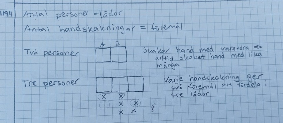 Jag tänker att antal personer är lådor och antal handskakningar är föremål. Min första tanke är att jag ska göra en falluppdelning, men det blir problem redan vid tre personer.