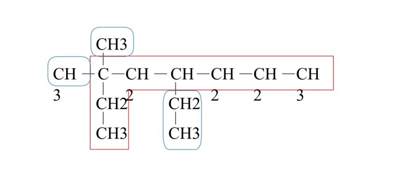 jag vet att den längsta stamkolvätet är 8 kol, som är markerat med rött, det betyder att föreningen slutar med oktan, an för att det är enkelbindningar. Sen vet jag att jag har två metylgrupper och en etylgrupp