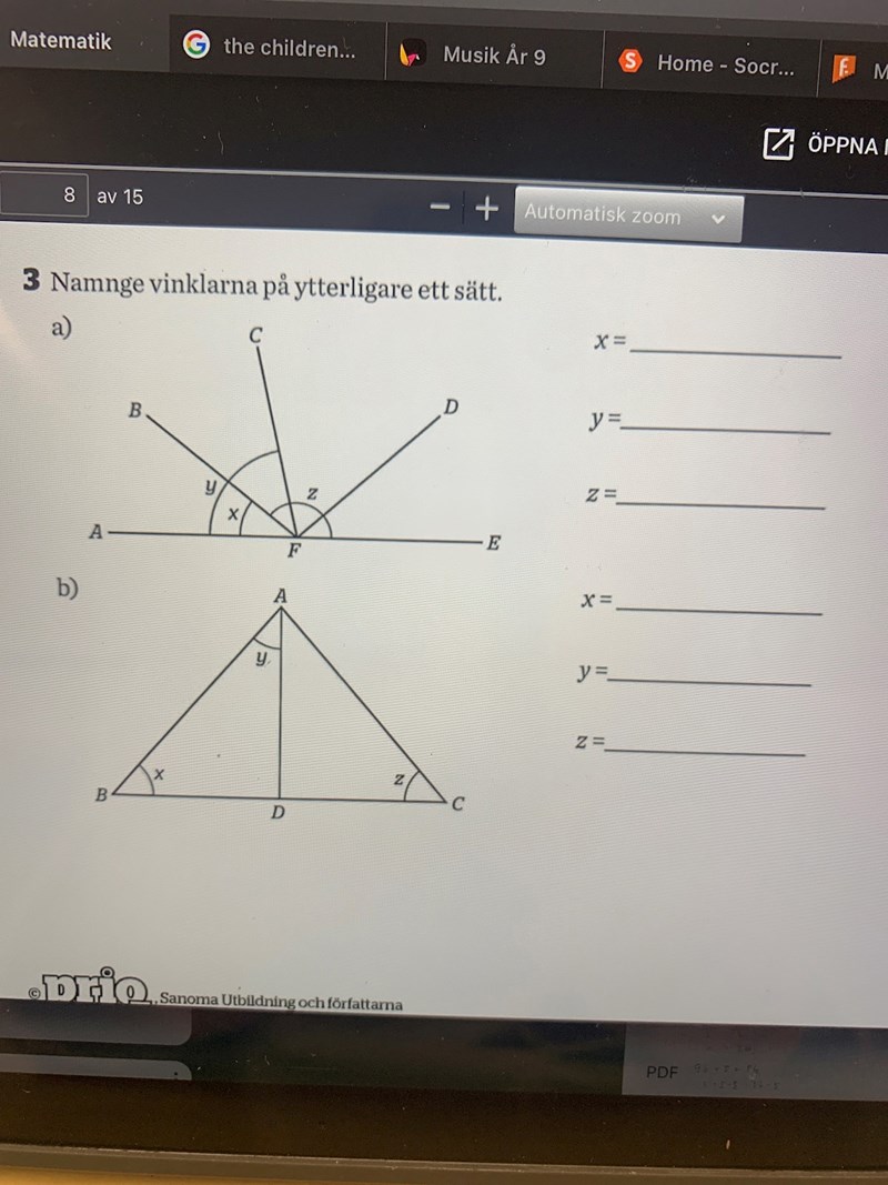 Troligen menar de namn på formen "punkt-spets-punkt". T ex i a) blir x:s namn AFB eftersom en "pil" har spetsen i punkten F och har strålar in mot spetsen från A och B.