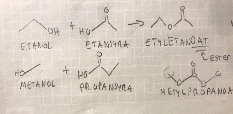 Om du utgår från etanol får du alltså kvar en etylgrupp, medan etansyrans (ättiksyrans) korresponderande bas kallas för etanoat (eller acetat). Estern som bildas kallas alltså för etyletanoat (eller etylacetat).