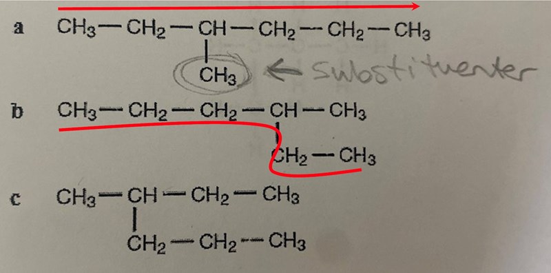 För a. är det enkelt att se, eftersom vi är vana vida att läsa vänster till höger, och i a. kan man bara följa stamkolkedjan. Dessutom är strukturen visad så att metylgruppen sitter i rätt nummerordning.