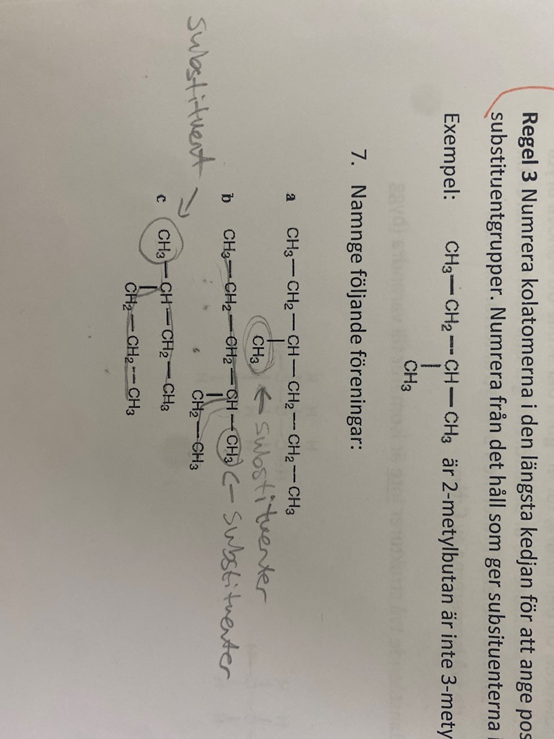 Stamkolkejdan (markerad med blyerts) har sex stycken kol. Om du räknar från ena hållet sitter metylgruppen på kol fyra; räknar du från det andra på kol tre. Eftersom du skall ha så låga värden som möjligt på substituenterna så sitter metylgruppen på kol nummer tre.