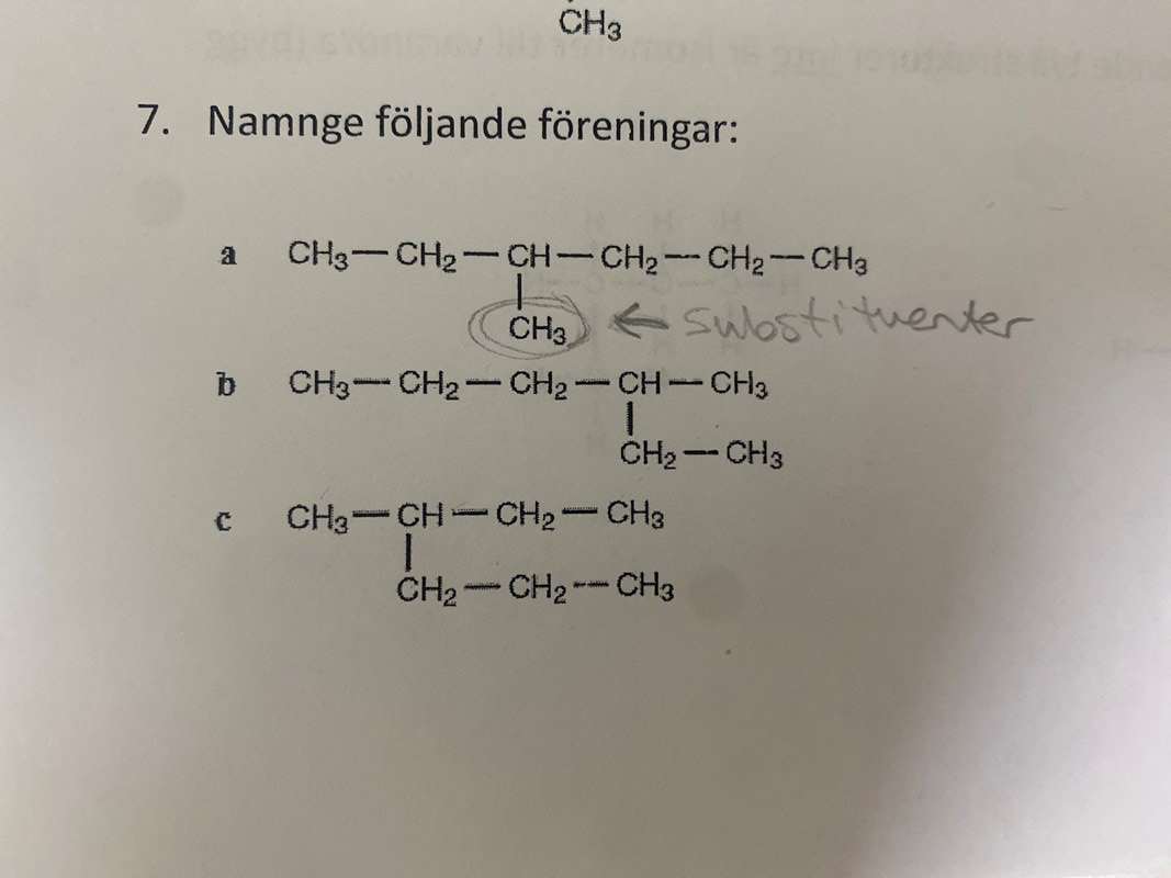 Menar du 7c, så sitter metylgruppen på kol nummer tre: 3-metylhexan.