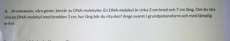 Förstora. En DNA-molekyl är som det står i uppgiften 2 nm bred, och den ska ritas som 3 cm bred. 3 cm är mycket mer än 2 nm, alltså måste den förstoras/skalas upp.