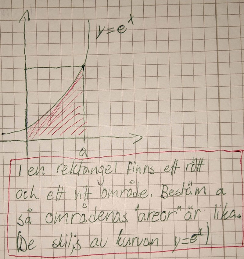 Den röda arean ska alltså vara lika med den vita. De är inneförslutna i en rektangel som avgränsas av kordinatoraxlarna, och delas av kurvan y=ex