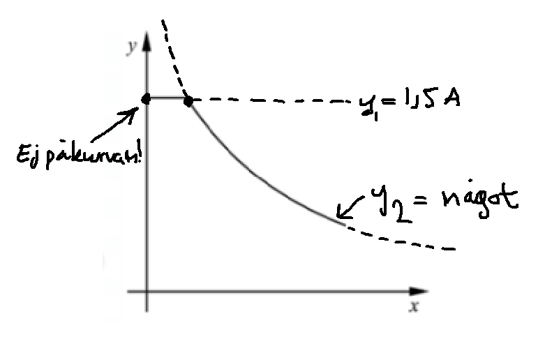 Man kan tänka att grafen är uppdelad i två funktioner, en funktion y1 för den horisontella linjen och en annan funktion y2 för delen där strömmen minskar. Differentialekvationen i frågan gäller bara för y2. Det innebär att vi inte kan använda (0, 1.5) som randvillkor eftersom den punkten egentligen ligger på y1 och inte på y2.