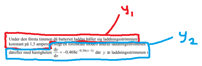 Men det står även i frågan att derivatan endast är det uttrycket när den väl börjar att minska. Lägg märke till att det står "därefter", alltså att efter ett konstant värde på y = 1,5 börjar ett nytt samband att gälla.