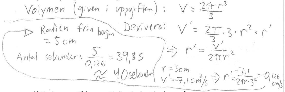 Nu är jag lite förvirrad. Hur kan dh/dt = 2* dr/dt. dh/dt = -7,1 / s*pi*(h/2)^2 = -0,1255 cm/s. Tiden då h = 10 ger 10 / 0,1255 = ca. 80 sekunder. Jag skrev om så att r = h/2.