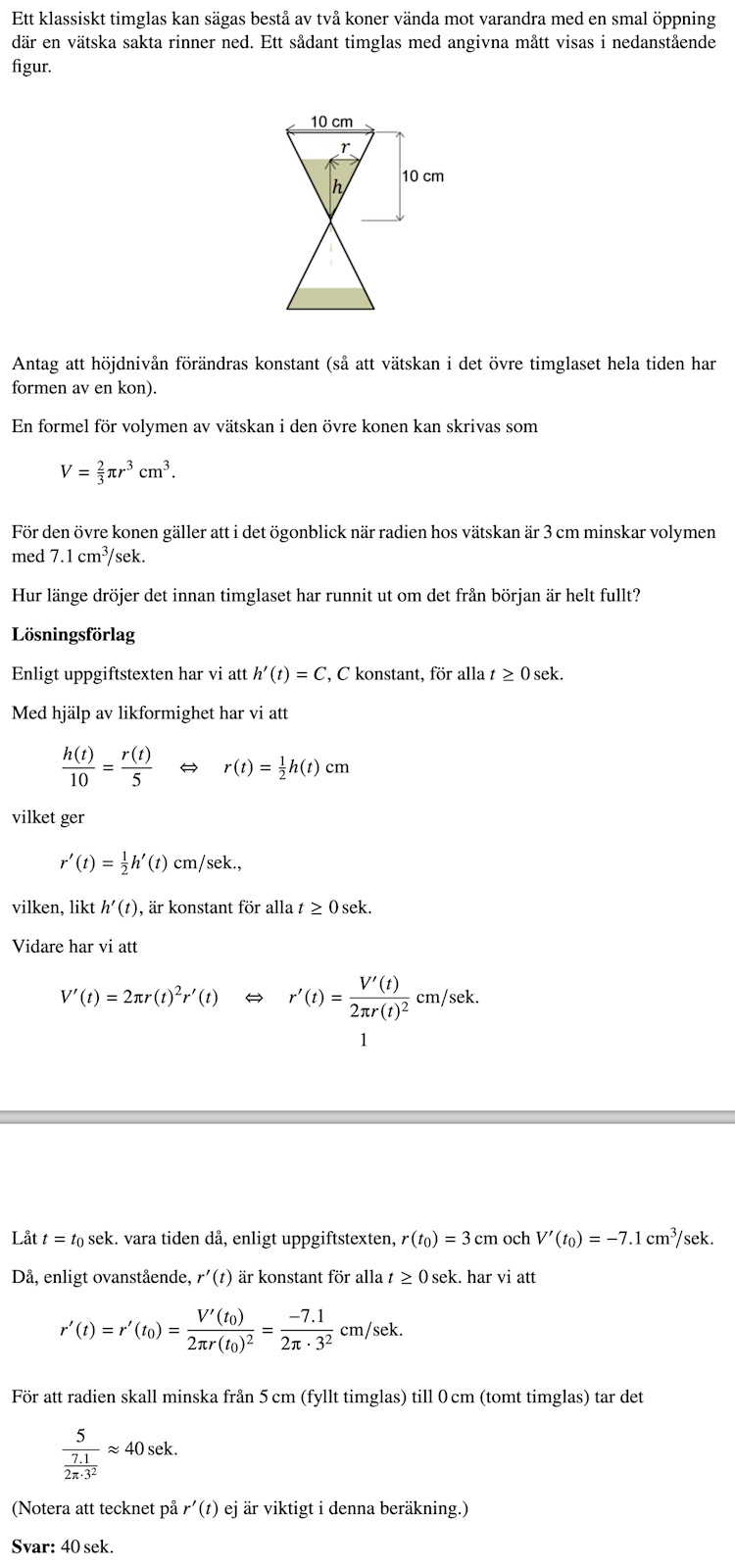 Jag gjorde så att jag från början skrev om allt i termer av h. Dvs. r = h/2. Höjden från början är 10 cm. 0,1255t = 10 ger t= 70,64 s. Varför fungerar ej mitt svar? Och varför måste man enbart ta hänsyn till den konstanta höjdändringen och inte t.ex. dv/dh?