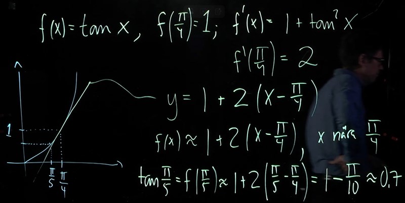 Här är ett exempel från Lars Filipson då närmevärde kring pi/5 är sökt via det som är känt f(x)=tan x och f(pi/4)=1.