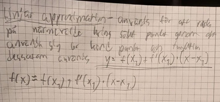 Trinity2 skrev:Den linjära approximationen är bra i en liten omgivning av x_1. Hur bra den är beror på hur stort fel man accepterar. Det här är kanske inledning till Taylor-serier och då kommer uppskattningar av resttermen (felet) in i bilden, men här kankse det bara är en lättsam introduktion. Man approximerar en kurva med dessa tangent. Hur bra denna är beror på var på kurvan man är, hur mycket kurvan kröker sig just i den punkten etc.