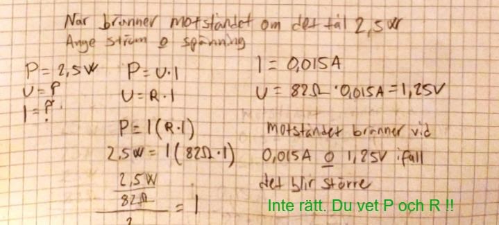 Hej! skulle behöva hjälp med denna uppgift: När bränner motståndet ifall det tål 2,5W och har Resistansen 82 ohm, jag ska ange ström och spänning. Jag gjorde denna uppgift men fick en kommentar att det inte var rätt, men ser inte någonting fel i min uträkning, är det någon som har någon idé på vad jag gör för fel? jag satte liksom in R*I istället för U