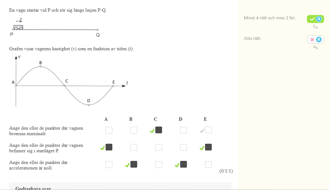Hej, förstår nästan hela uppgiften men jag undrar varför även alternativ E stämmer på första raden. Vagnen bromsas maximalt då lutningen (accelerationen) är som mest negativ. Detta sker i punkt C. I punkt E är lutningen inte negativ.