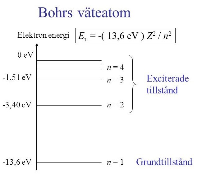 2. Om väteatomen befinner sig i sitt grundtillstånd krävs att fotonen har exakt rätt energi för att excitera denne till ett högre tillstånd. För att exempelvis lyfta atomen till det första exciterade tillståndet n = 2, måste fotonen ha: