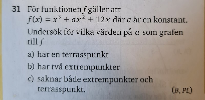 Det är en bra början. Men nu måste du dessutom undersöka om dessa värden på verkligen ger terasspunkter eller inte. Bara för att måste det inte vara en terasspunkt. Det kan vara en minimipunkt också som hos . Där blir , trots att det inte är en terasspunkt.
