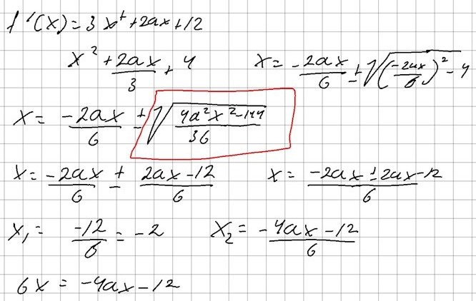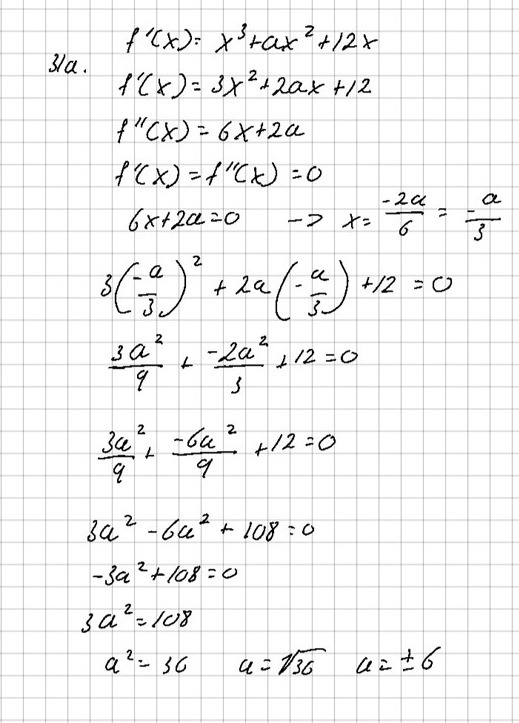Jag la in a=+-6 i f'(x)=0 och löste att terrasspunkterna kan finnas vid x=2 och x=-2, jag testade sedan lutningen ett tal mindre och ett tal mer och de hade positiv luting på båda sidorna.