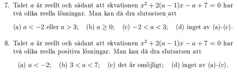 Från uppgift 7 vet vi att a < -2 eller a > 3 för att ekvationen ska ha två olika reella lösningar.