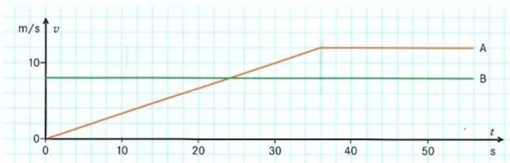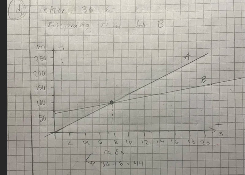 Jag har försökt göra en tabell på sträckorna efter det gått 36s - det är för att linjen har en lutning innan, och jag vet inte hur man ska rita det på en s-t graf. Här utgår jag från att B har ett försprång på 72 m efter 36s.