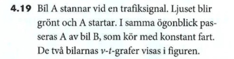 Enligt min graf har de samma sträcka efter ca 8 sekunder.. men det skulle innebära att bil A hinner upp bil B efter 36s+8s=44s vilket är fel då facit säger 54s.