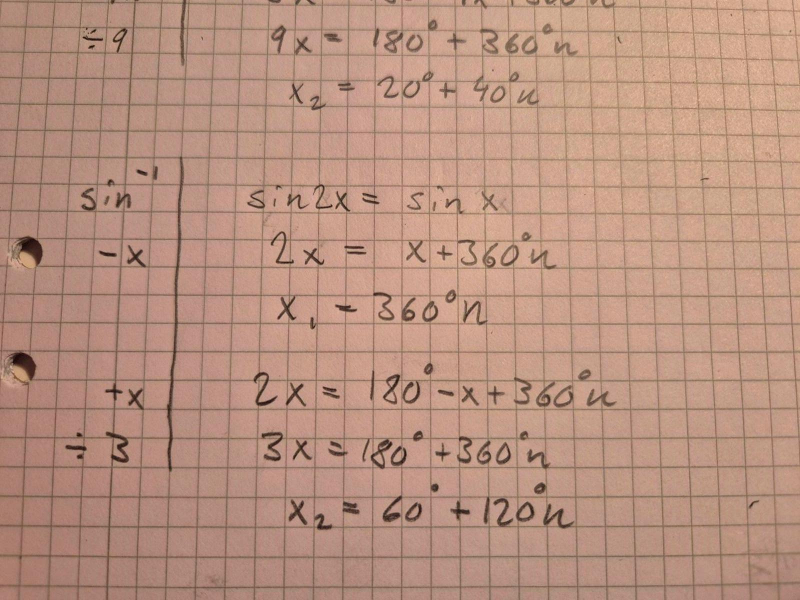 Hej. Jag är medveten om att det är inversen som används: "stryka"var mest ett praktiskt trivialnamn. Det jag inte förstod var varför det (till synes) inte fungerar att bara använda inversen i ekvationen sinx=sin2x. Jag bifogar bilder på mina lösningar nedan.