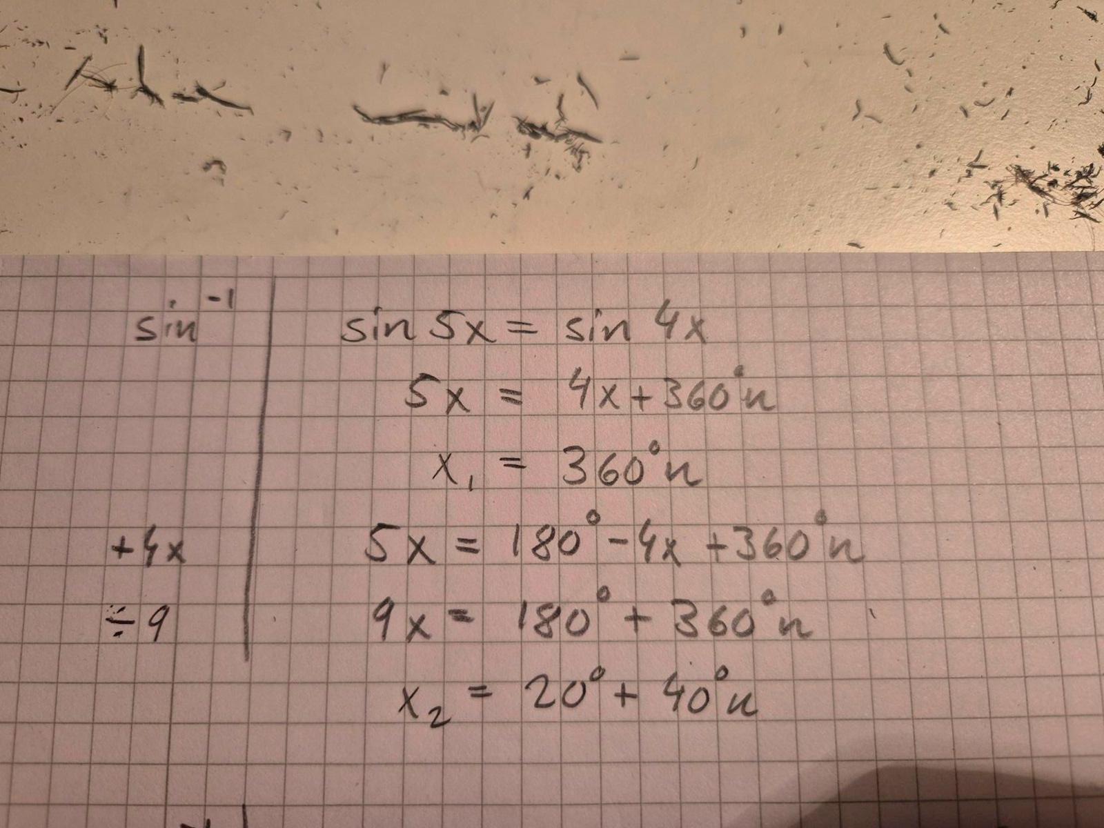 Här är en lösning som enligt facit är rätt. sin4x=sin5x. Marginalen visar vilka åtgärder som görs. (Inser att jag glömt skriva att 4x subtraheras efter steg 1.)