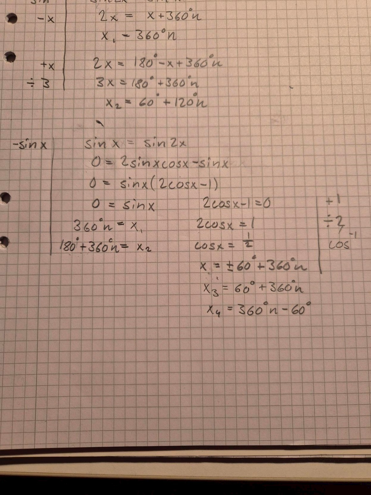 Skillnaden på de två sista lösningarna är att jag i den sista får både x=60 + 360n och x=360n - 60. Dessutom menade min lärare idag att det inte går att ta inversen till sinx=sin2x direkt, eftersom sin2x går att utveckla. Vilket gäller, egentligen?