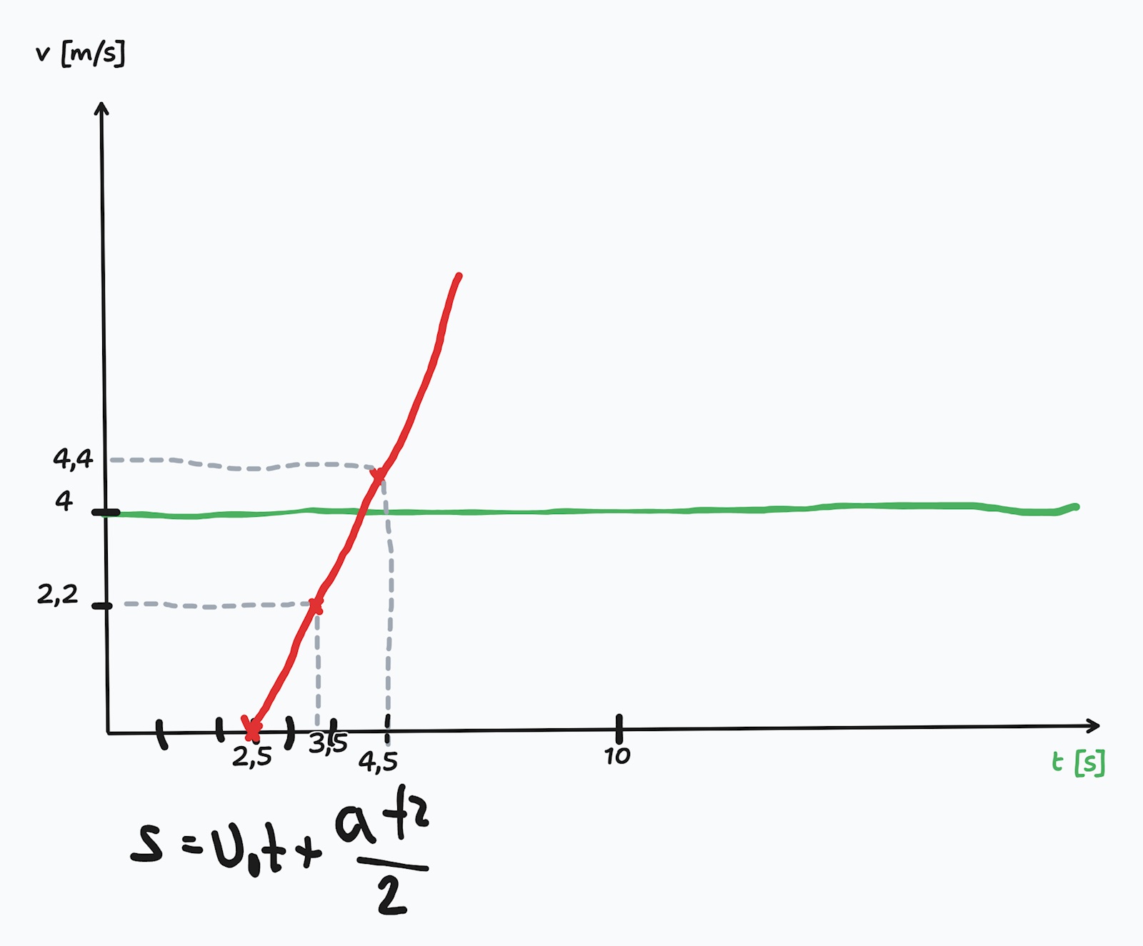 Förmodligen finns i teoridelen av kapitlet om väg-hastighet-tid härledningar av sträckan s efter tid t med konstant hastighet v (s=vt) och sträckan efter tid med konstant acceleration s=at2/2.