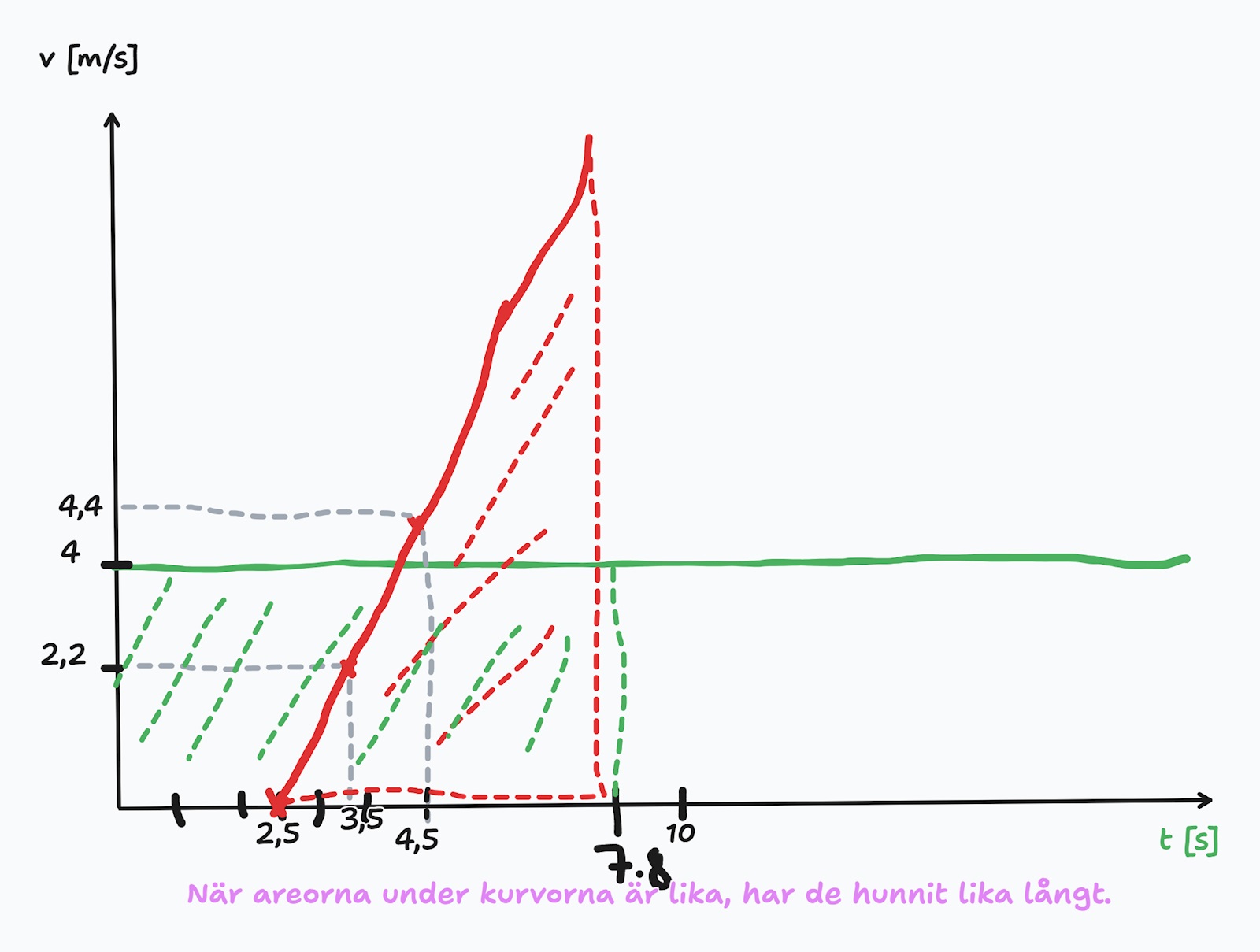 Det som efterfrågas är tidpunkten då dessa tillryggalagda sträckor är lika stora, dvs då areorna är lika stora.