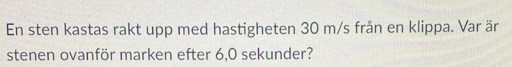 Du bör utgå från formeln s = s0 + v0t+½at2. Det står i uppgiften att stenen skall landa på marken 50 m ner, så s0 = 50, och du vet att v0 = 30 m/s och att a = 9,82 m/s2 (eller 10...). Lös ekvationen s = 0. Alternativt kan du lösa ekvationen 30t+5s = -50.