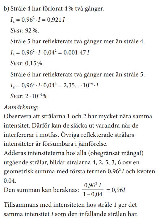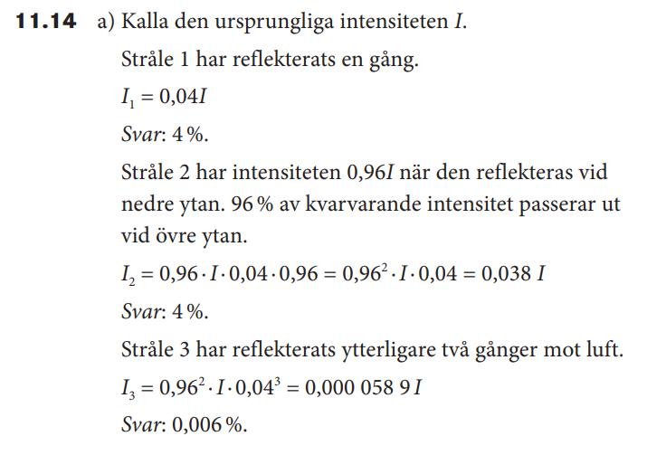 Alltså strålen som sen fortsätter i glaset, den är 96% av den ursprungliga intensiteten ellerhur? Och sen reflekterar den igen där nere, dvs 4% av 96% är kvar i glaset? Eller? Enligt facit så är det tänkandet fel eftersom enligt facit så har stråle 2 4% av den ursprungliga intensiteten...
