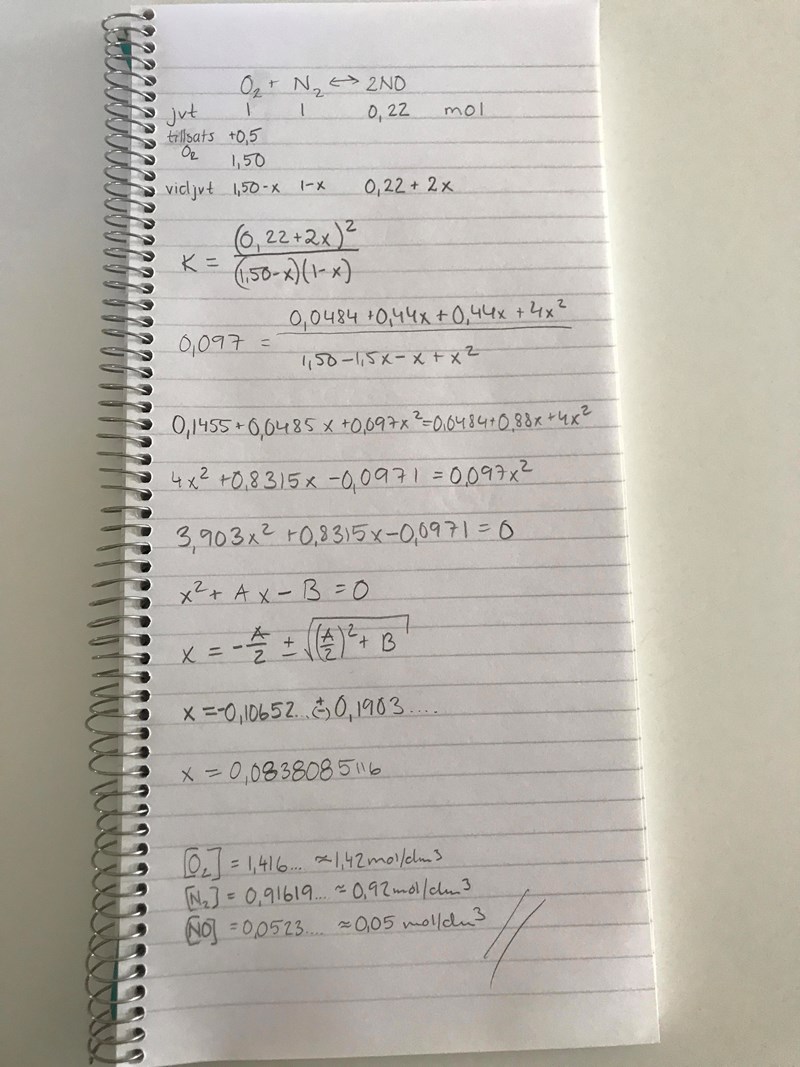 Jämviktskonstanten K= 0,097 och man uppmätte koncentrationerna O2= 1,00 mol/dm3, N2 = 1,0 mol/dm3 och NO = 0,22 mol/dm3. Volymen = 1,0 dm3.