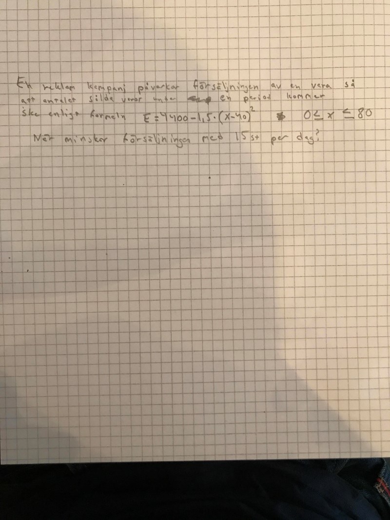 XDXDXDXDXDXD skrev:lamayo skrev:Utan att ha läst uppgiften tror jag det har blivit slarvfel när du löser ut x ur 120-3x=-15. Flyttar du över 15 från HL får du 135-3x=0. Sedan när du flyttar över 3x får du 135=3x. Då ser du att x=45.