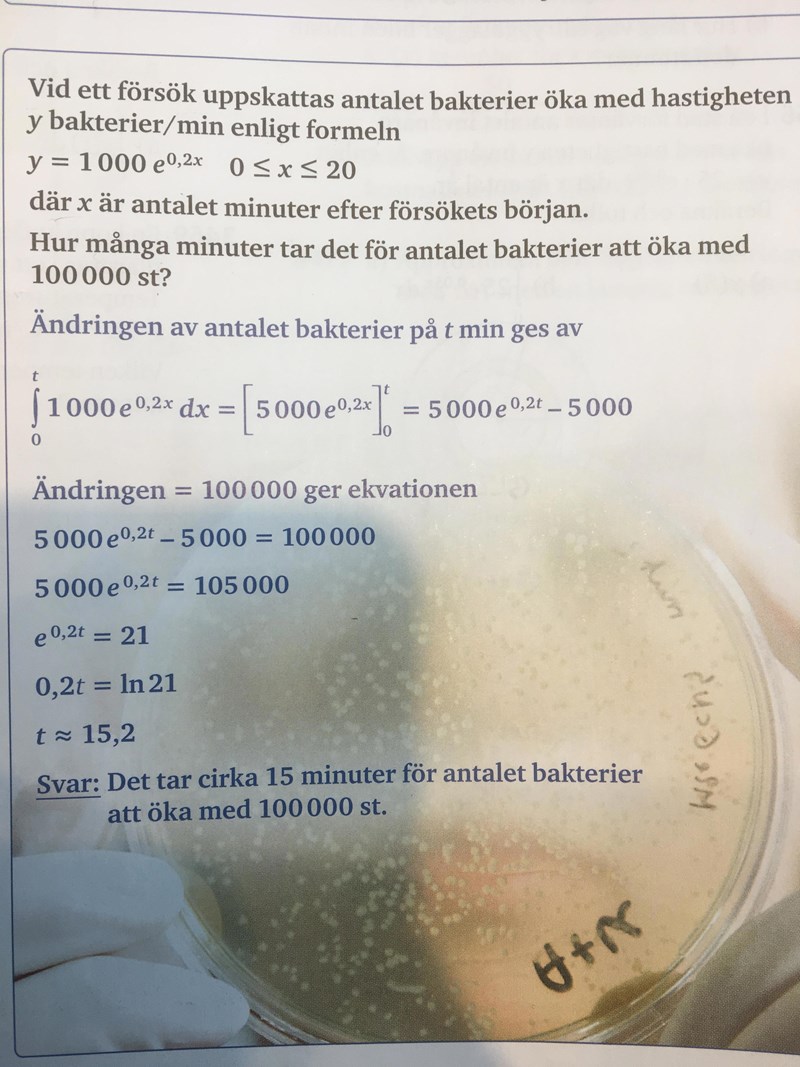 y= 1000e0,2x = förändringen av antalet bakterier / min , då tänkte jag ställa en ekvation 1000e0,2x = 100000.