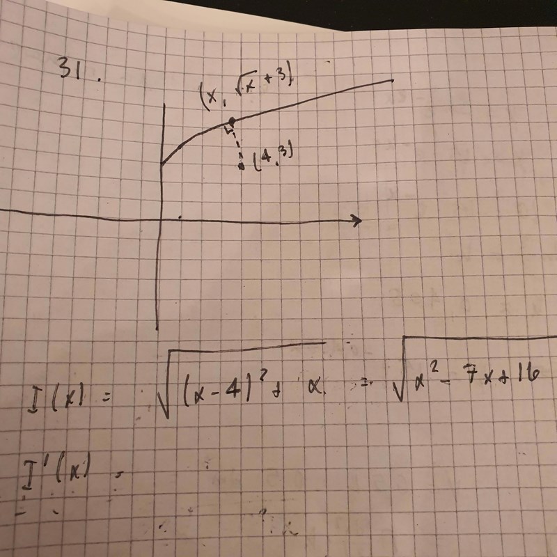 Du har alltså funktionen d(x)=(x-4)2+xd(x)=\sqrt{(x-4)^2+x} där d är avståndet mellan punkten och linjen. Bilda funktionen D(x) = (d(x))2, derivera D(x) och sätt derivatan lika med 0. Kommer du vidare?