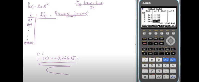 - För h = 0,001 så blir differenskvotens täljare f(10+0,001) - f(10-0,001) = f(10,001) - f(9,999) och nämnaren blir 2*0,001 = 0,002.