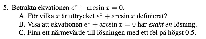 Hej, jag skulle behöva hjälp med följande uppgift. a) är avklarad, och är halvvägs färdig med b). Jag har klurat ut att f(x)=0 ligger på intervallet -1<x<0 och att f'(x) är positiv i hela intervallet. Men hur approximerar jag funktionen så att jag får ett närmevärde?