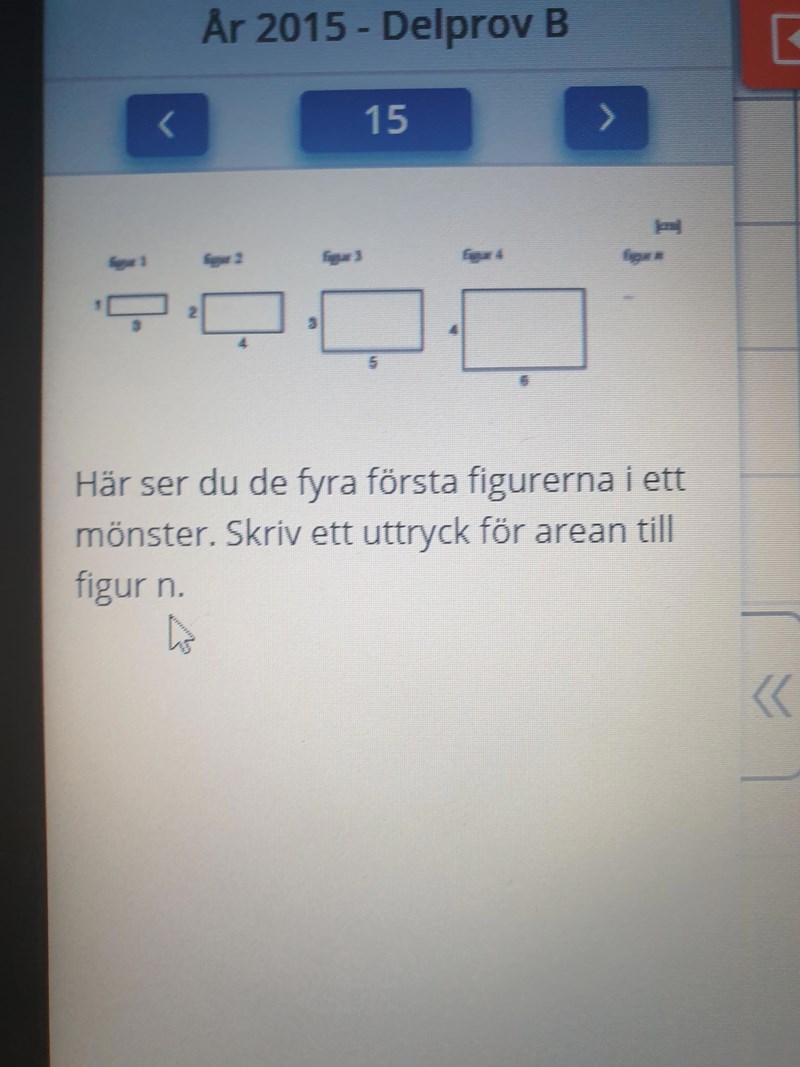 Jag har jobbat med denna fråga jättelänge nu och jag trodde att mönstret var geometrisk, alltså att formeln som skulle passa är An= a1×k upphöjt till n. Men jag tyckte faktiskt själv att den formeln var lite krånglig och den stämde inte ens. Det rätta svaret är n(n+2).