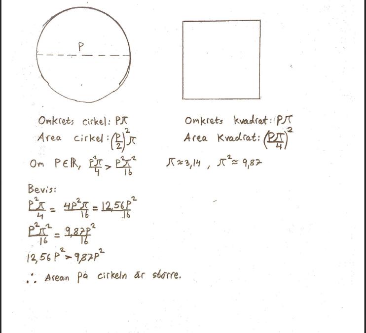 vi vet att kvadrat omkrets och cirkel omkrets är lika Så visar att cirkels area är större en kvadrats area.