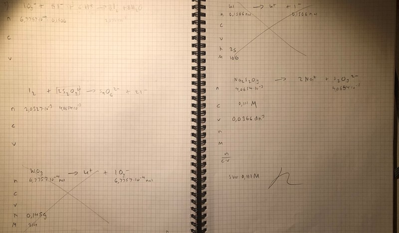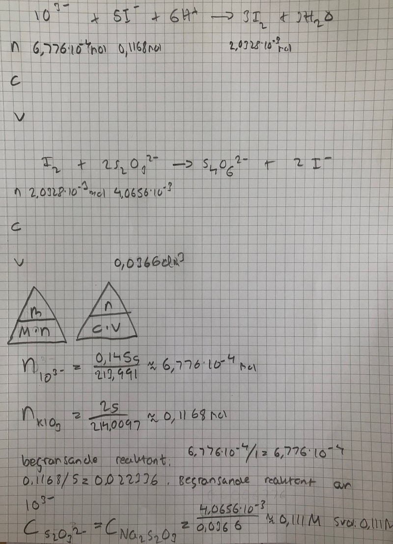 I2 + 2S2O32- → S4O62- + 2I- (rxn mellan bildad jod och tiosulfat)