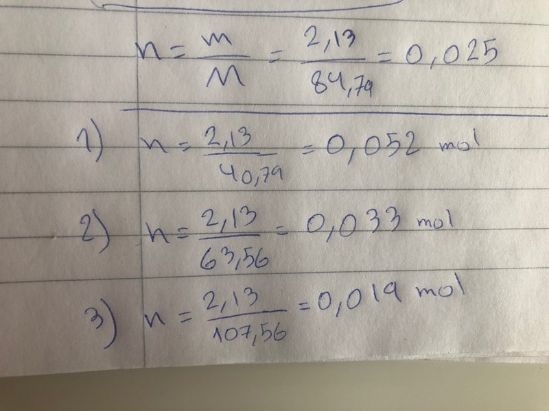 är det: n = m/M ----> n= 84,79/2,13= 0,025 mol