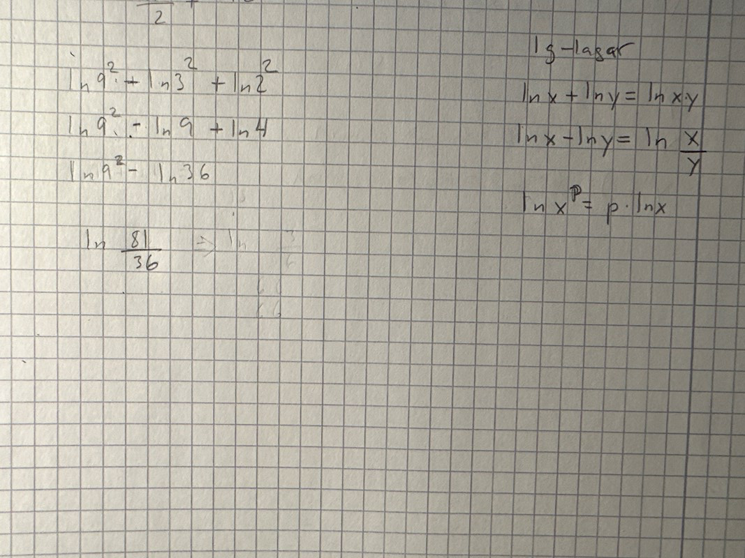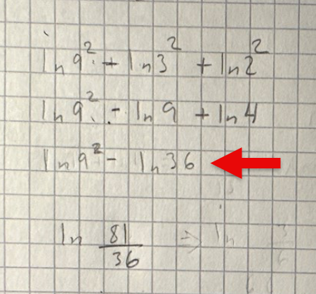 Här blir det fel. På raden ovanför står det inte ...-(ln9 + ln4).