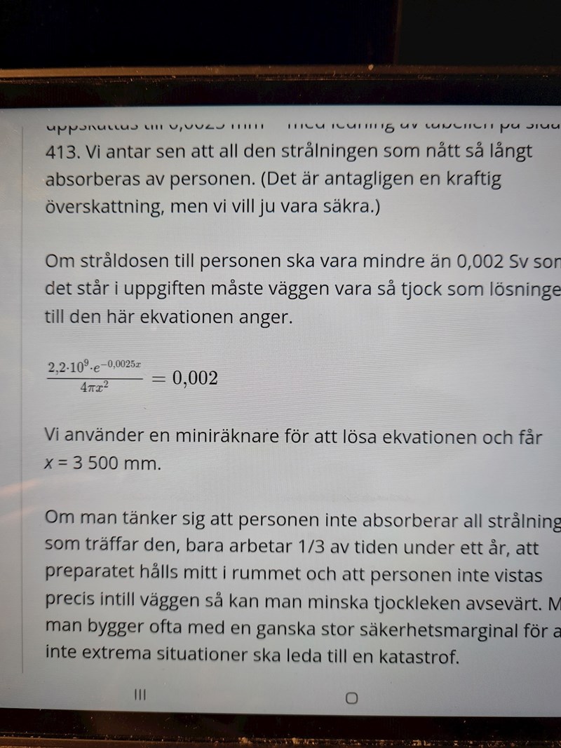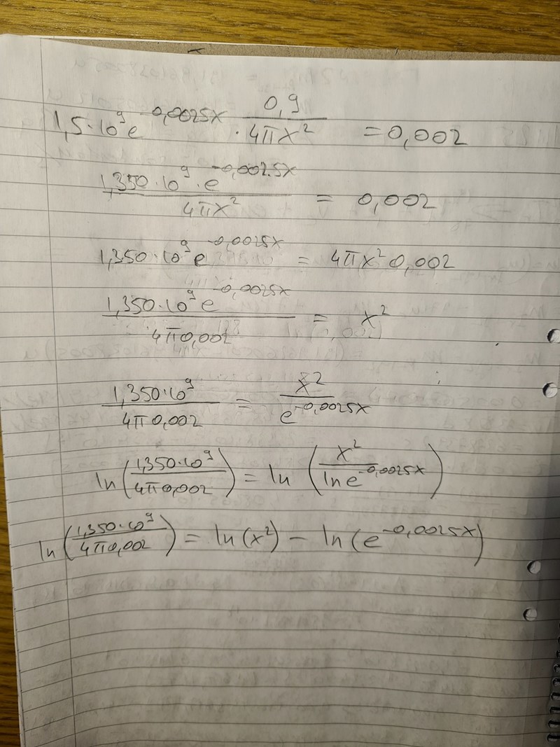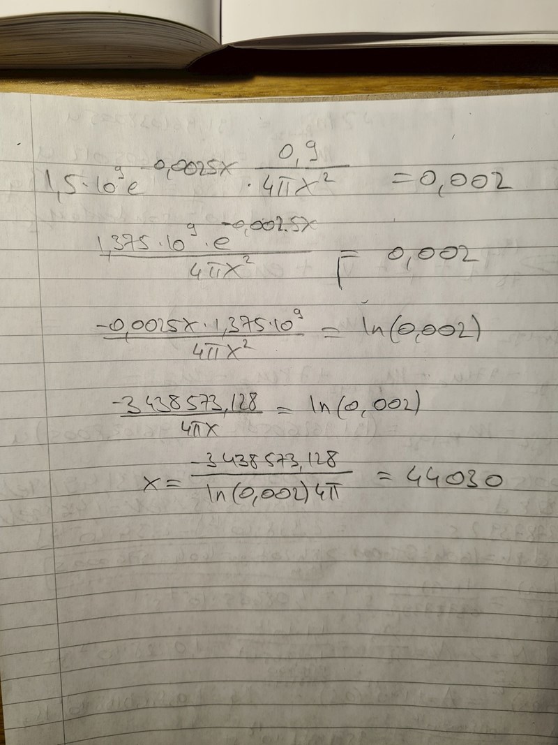 Jag bifogar även lösningsförslaget på deluppgift c) dvs. själva ekvationen. Eftersom uppgiften går ut på att uppskatta ett värde har jag uppskattat värdet 1,5×10^9 istället för 2,2×10^9. Annars är ekvationen samma.