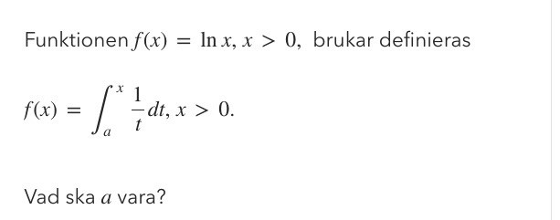 Om vi utifrån detta tittar på uppgiften så blir jag fundersam. Jag tycker att man kan definiera som man vill; olika a ger olika definitioner av ln x. Så jag vet inte hur boken tänkt sig svaret.