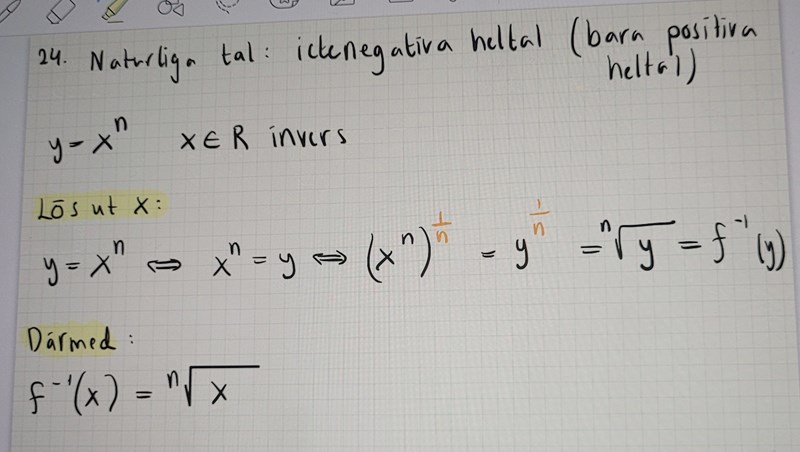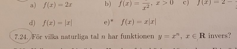 Du vet säkert att om en lodrät linje skär en kurva på två ställen, så är det inte en funktion. På liknande sätt är det så att om en vågrät linje skär en funktionskurva, så har funktionen inte en invers. Funktionen f(x) = x2t ser i stort sett ut så här: U. Funktionen g(x) = x2t+1 ser i stort sett ut så här: /. Är du med på varför g(x) men inte f(x) har en invers, om definitionsmängden = alla reella tal?