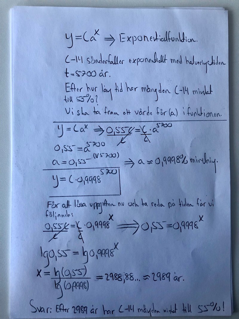 5700 år är halveringstiden för C-14, så efter 5700 år finns hälften av det kol-14 som fanns från början kvar. Detta ger upphov till en exponentialfunktion som kan skrivas på många sätt, exempelvis $$N=N_0\cdot 2^{-\frac{t}{5700}$$ eller där basen kan beräknas genom att man vet att .