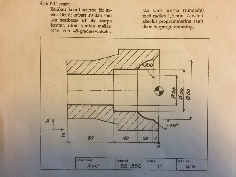 Jag försöker nu igen med uppgiften 4.16. Nu har jag i alla fall fått fram x-värden för 1 och 2a. När 1,5 mm av 7 mm längst till höger ska vara avfasning, återstår 5,5 mm i z-led som ligger i 45 grader. Jag har kommit fram till att katetrarna i trianglar med 45 graders vinkel och en rät vinkel är lika långa. Därför kan vi utgå från att öppningen genom dessa 5,5 mm på varje sida breddar diametern med totalt 2 * 5,5 mm = 11 mm.