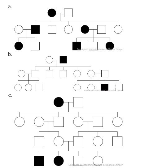 Okej, så jag har listat ut c men a. har jag fortfarande fastnat på, men jag vet att det är en dominant sjukdom eftersom den inte hoppar över generationer och för att det krävs en förälders gener för att egenskapen ska uttryckas vilket vi ser i familjen längst till höger där en frisk pappa får en sjuk dotter. stämmer det och hur avgör man om den är autosomal eller könsbunden